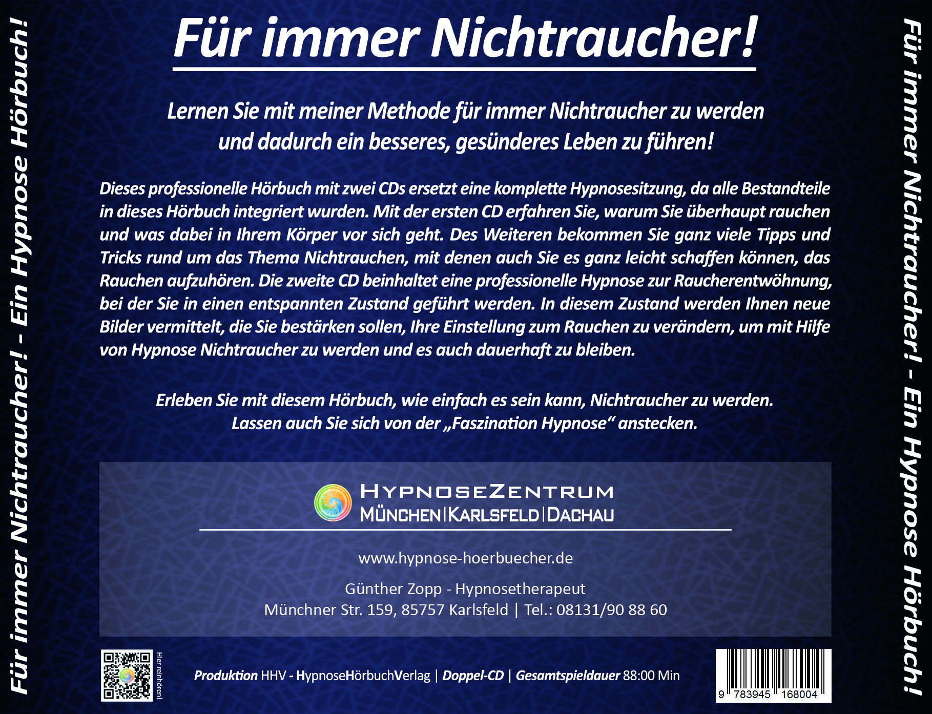 Dieses professionelle Hörbuch mit zwei CDs, entwickelt vom HypnoseZentrum München, ersetzt eine komplette Hypnosesitzung, da alle Bestandteile in dieses Hörbuch integriert wurden.